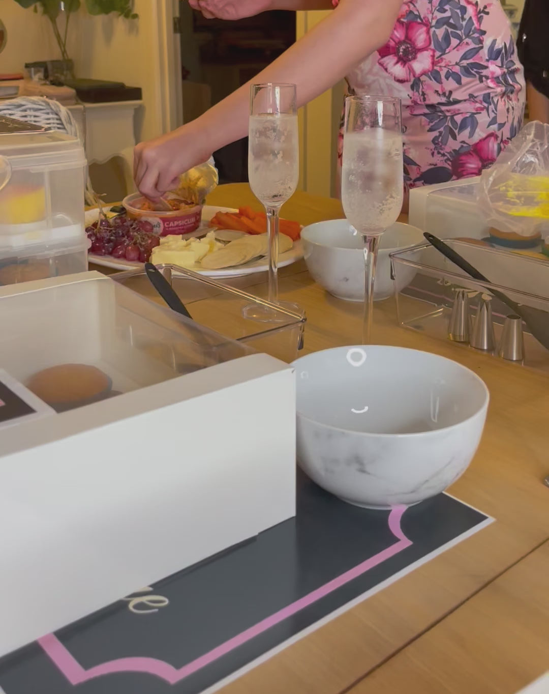 Welcome and Set-Up: Guests arrive and are greeted with a drink. They find a spot at one of the decorating stations, set up with all the necessary tools and supplies.